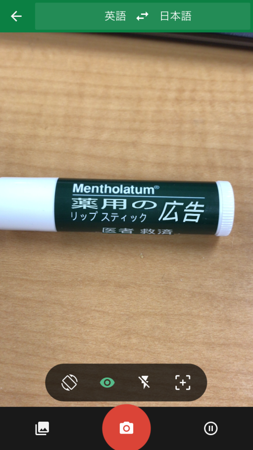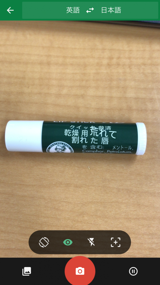 下の方に小さく映った「医者 救済」が気になりますが、角度を変えてみると「クイック救済」となんとなく意味がわかる訳になりました。その後に続く英語「For dry,chopped cracked lips」は「乾燥用 荒れて割れた唇」となんとなく意味が通るように訳せています。