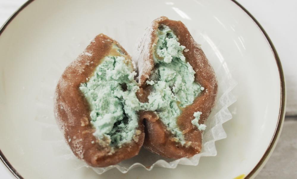 本来のもち生地のとろっとした食感やホイップのフワッとした舌触りは失われますが、適度にかたくなったもち生地は求肥(ぎゅうひ)のようであり、ホイップ部分はまろやかでありながらシャリシャリとした食感に。清涼感のあるミントの香りとの相性は抜群です。イメージとしては「チョコミントの雪見だいふく」という印象です。