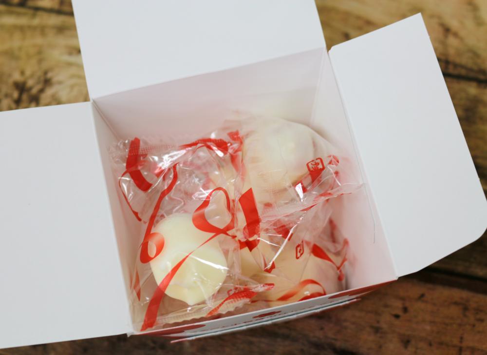 赤と白を基調としたパッケージはお店の冷蔵ケースの中でもパッと目を引く可愛らしさ。四角い箱の中に、個包装された標準5粒のアイスが入っています(苺粒の大きさによって異なることも)。価格は298円(税込)なので、1つ約60円の高級アイスです。