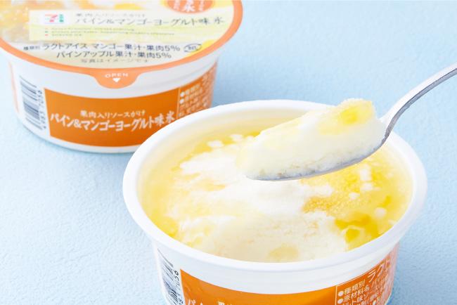 一方の「パイン&マンゴーヨーグルト味氷」は、ヨーグルト味のかき氷の中にヨーグルトソースを入れ、果肉入りパイン&マンゴーソースをかけたもの。ヨーグルトの濃密な味わいにフルーツの酸味と甘みがよく合う一品です。価格は159円。