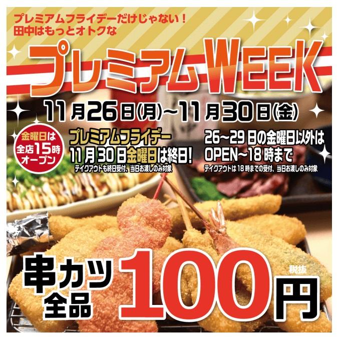 またプレミアムフライデーに合わせ、11月26日から29日までの4日間は「プレミアムWEEK」として、18時までに入店すると串カツ全品108円で提供されます。