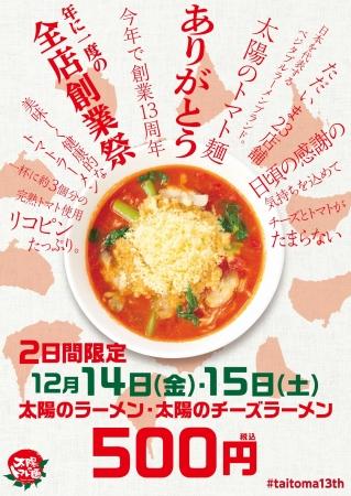 飲食店チェーンを展開するイートアンドのトマトラーメン専門店「太陽のトマト麺」の各店では、2018年12月14日と15日の2日間限定で「太陽のトマト麺創業祭」を開催します。