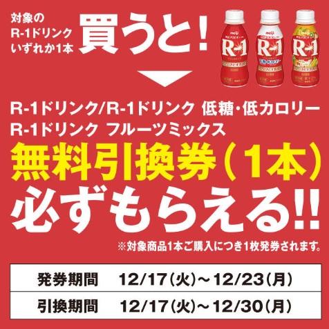 ミニストップで2019年12月17日~12月23日の期間、対象のR-1ドリンクを買うと「R-1ドリンク 低糖・低カロリー」などの無料引換券がもらえるキャンペーンを実施中です。