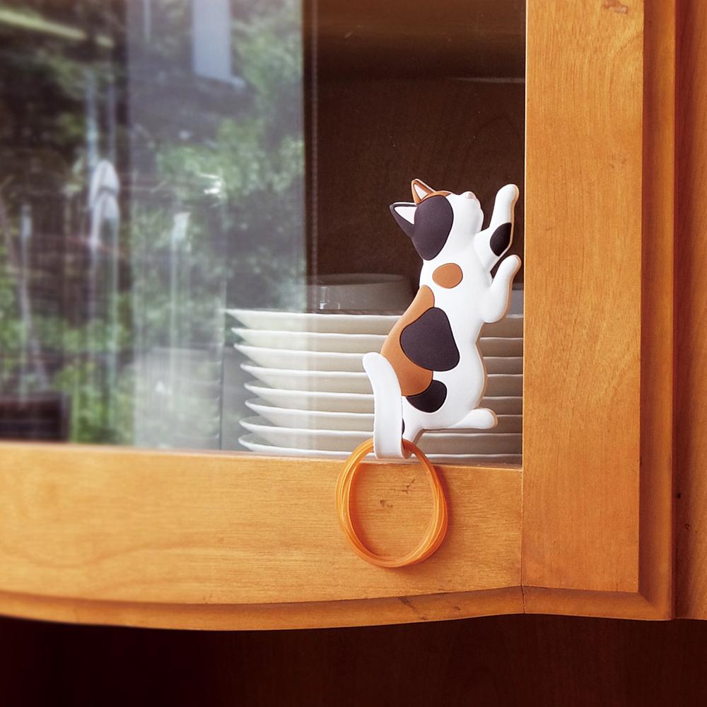しっぽを曲げるとフックに変身する、ドアや冷蔵庫にペタッと貼れるマグネット付きフックです。
