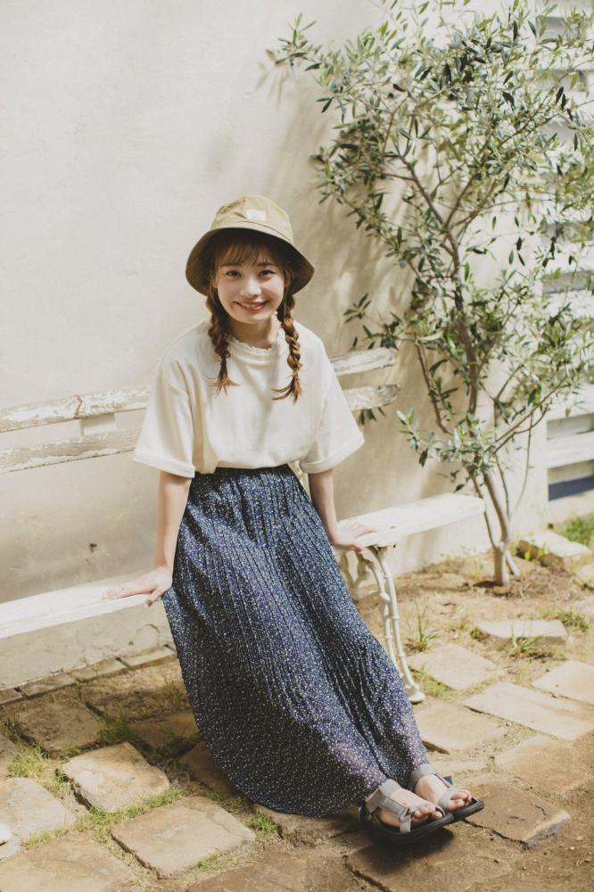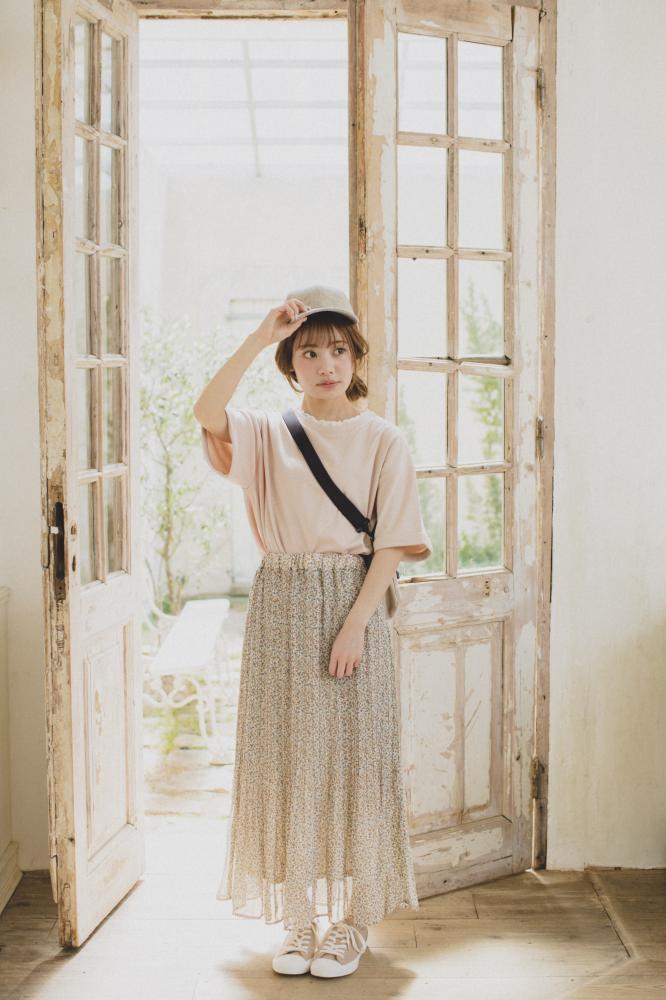 身長153cmのまるさんが、身長に関係なく着こなせる丈にこだわったプリーツスカート。裾がふわっと広がるプリーツと小さめの柄で、女性らしくどんなコーディネートにも馴染みやすいアイテムです。ドット柄はキナリ・ブラック、花柄はオフホワイト・ネイビーの計4色があります。