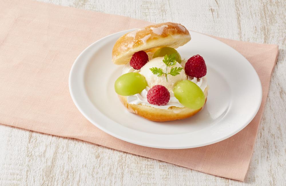 シュガードーナツにシャインマスカットや、バニラアイス、ホイップクリームなどが挟まれています。548円。