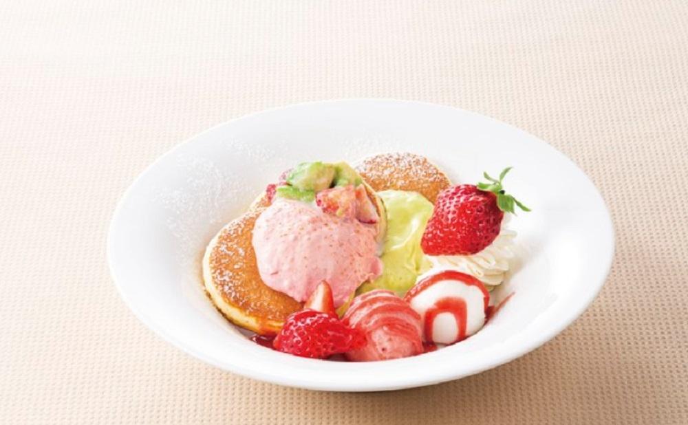 ふんわり焼き上げたパンケーキに、イチゴとアボカドのクリームをとろ〜りをかけた商品です。