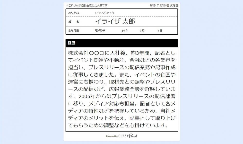 書き出しはよいものの、キーワードが少ないため、生年月日や経歴などがでたらめに作成されています。