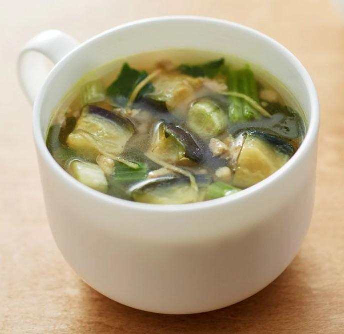 「食べるスープ 揚げ茄子と豚肉の生姜スープ」は、揚げ茄子のコクと、豚肉の旨みを生かした具だくさんのスープです。生姜を加え、さっぱりとした味わいで、夏にもぴったり。4食入りで、通常価格は390円です。