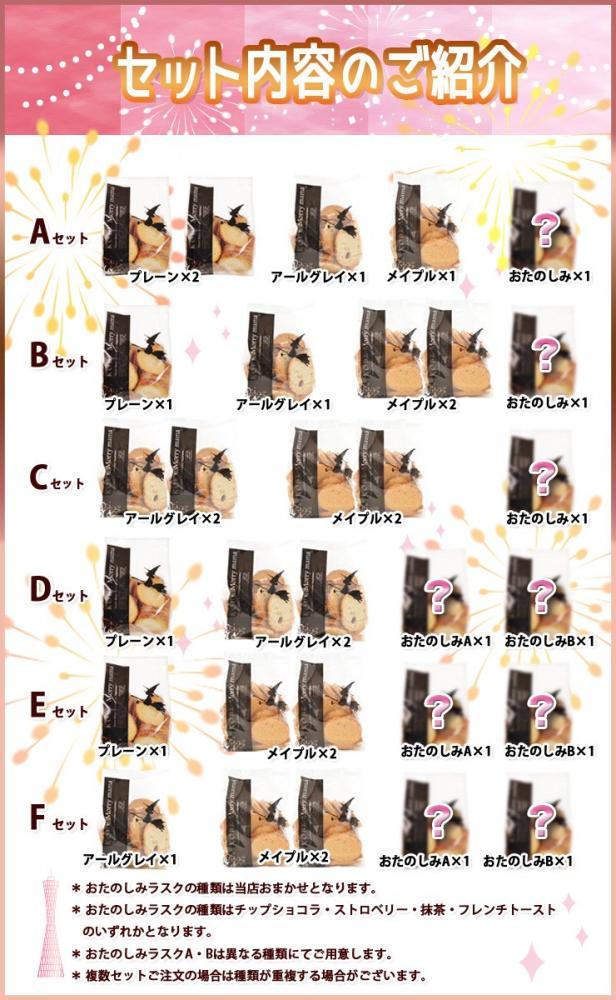 Aのセットでは、プレーン2袋、アールグレイ1袋、メイプル1袋、おたのしみ1袋が入っています。お楽しみラスクの種類は、チップショコラ、ストロベリー、抹茶、フレンチトーストからいずれかが入ります。選ぶことはできず、お店のおまかせです。