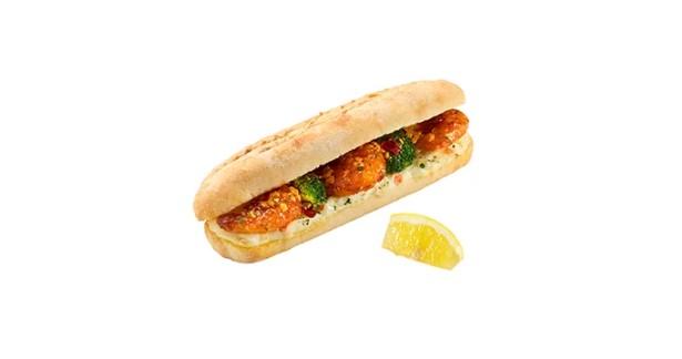 「焼きたてサンド さっぱりレモンのガーリックシュリンプ」は、殻付きの香ばしい海老に、ポテトサラダとブロッコリーを合わせました。ほどよくピリッとしたフライドガーリックソースは食欲をそそり、食べ応えのある一品。お好みでレモンを絞ると、さっぱり爽やかな風味になります。価格は単品で税込490円、セットで税込730円です。