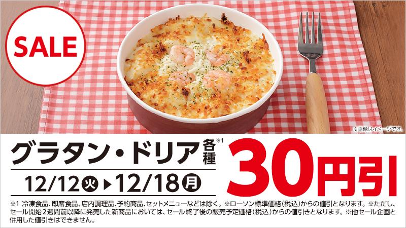 12月12日から18日までの期間、グラタン・ドリア各種が30円引きで購入できます。冷凍食品、即席食品、店内調理品、予約商品、セットメニューなどは対象外です。