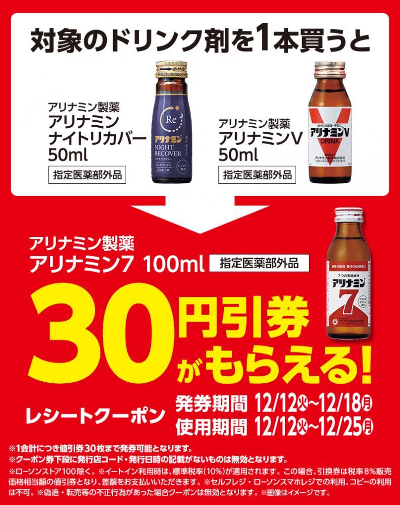 12月12日から18日までの期間、アリナミン製薬「アリナミン ナイトリカバー」「アリナミンV」(各50ml)のどちらか1本を購入すると、次回使える「アリナミン7」(100ml)30円引きクーポンがもらえます。
