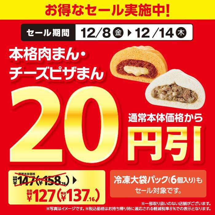 12月8日から14日までの期間、本格肉まん・チーズピザまんが本体価格から20円引きで購入できます。冷凍大袋パック(6個入り)もセールの対象です。
