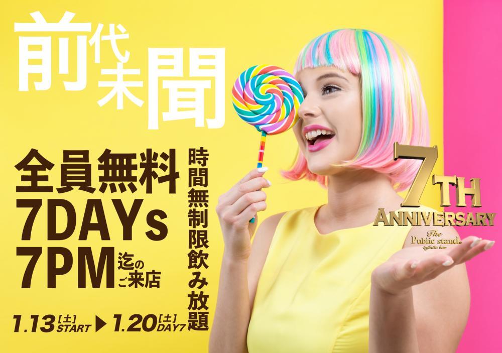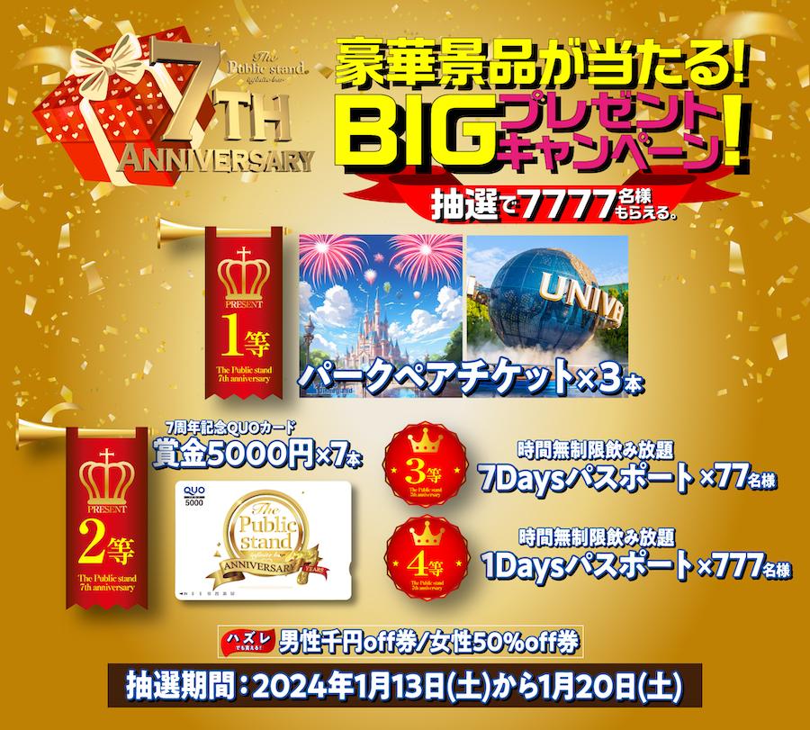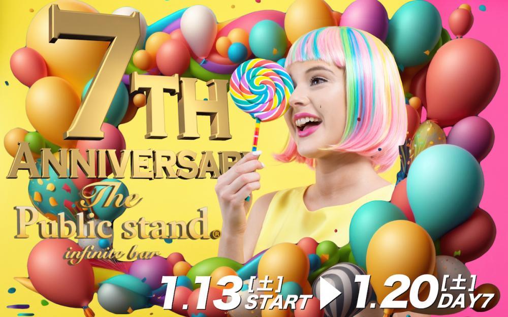 アミューズメントBARの「The Public stand」は、2024年1月13日から「7周年感謝祭WEEK」として3大キャンペーンを実施します。