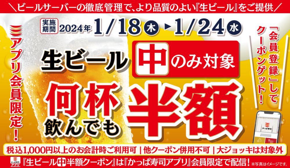 回転寿司チェーンのかっぱ寿司は2024年1月18日から、アプリ会員向けに「生ビール(中)半額クーポン」を配布しています。