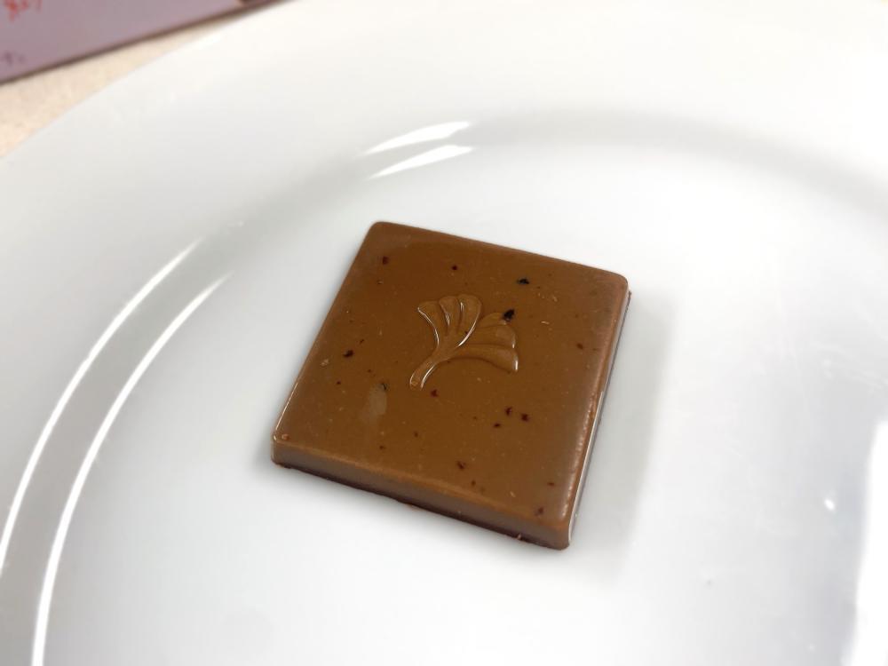 発酵バター入りのサブレを、ロレーヌ産岩塩と焦がしバターを入れたガーナミルク、ガーナブラックで包み、焼き菓子のフィアンティーヌをまぶした、複雑な構成。