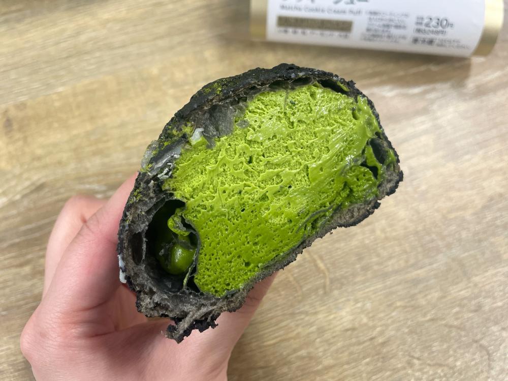 竹炭とブラックコーヒーパウダーが入ったクッキーシューをカットすると、なんとも華やかで鮮やかな緑が出現。