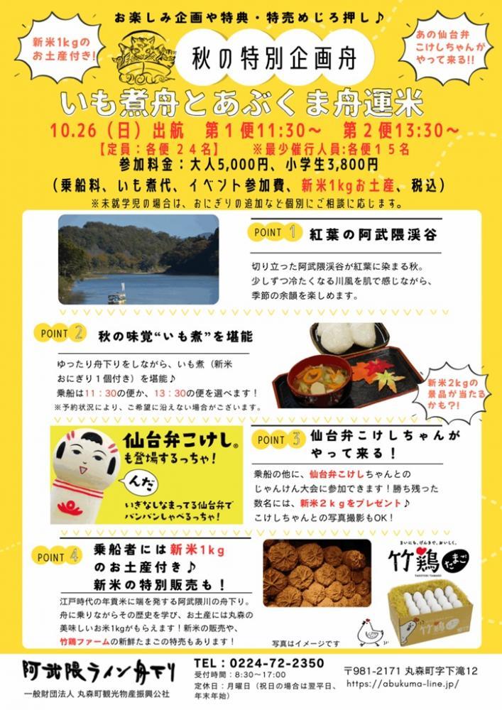 2025年10月26日、阿武隈ライン舟下り乗船場(丸森町字下滝12)を集合場所として、秋の特別企画「いも煮舟とあぶくま舟運米」が開催されます。