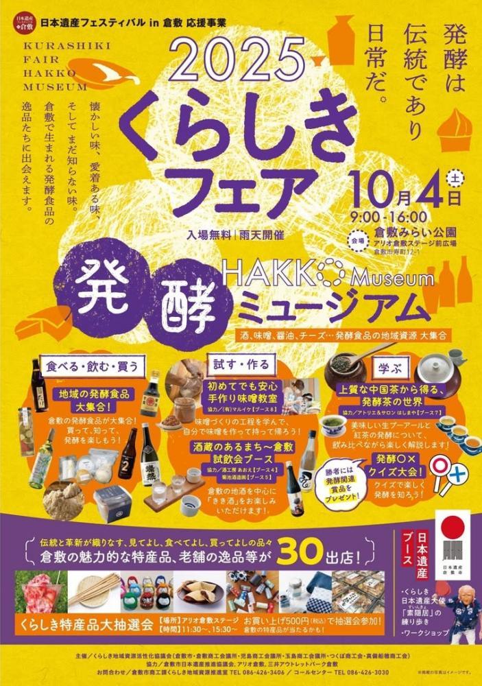 2025年10月4日、倉敷みらい公園アリオ倉敷ステージ前広場(倉敷市寿町12-1)にて「2025くらしきフェア ~発酵ミュージアム~」が開催されます。