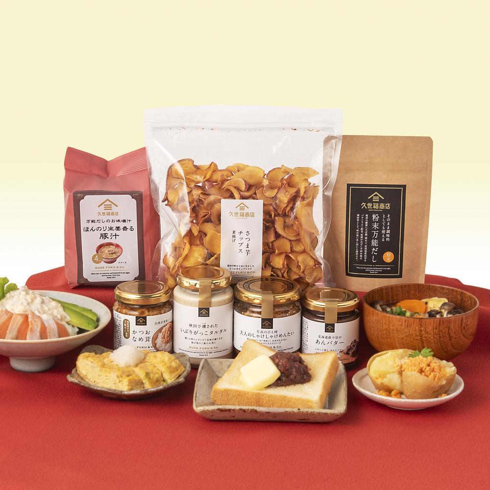 セット内容は、『至高のひと時 大人のしゃけしゃけめんたい』80g/『秋田で燻された いぶりがっこタルタル』160g/『かつおなめ茸』130g/『粉末万能だし』40g/『万能だしのお味噌汁 ほんのり生姜香る豚汁』4食/『北海道産小豆のあんバター』125g/『さつま芋チップス 素揚げ』125gです。