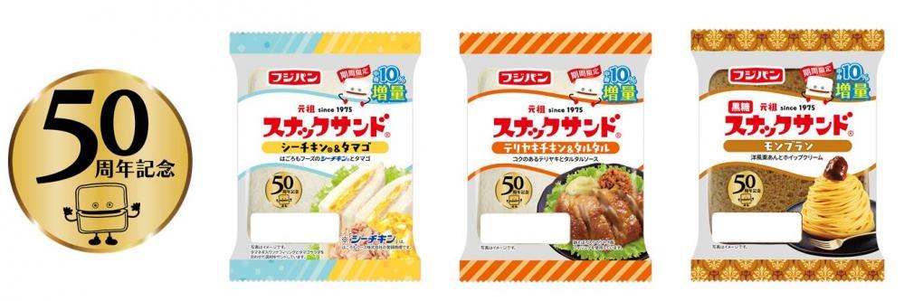 フジパンは、2025年10月1日から「スナックサンド」誕生50周年を記念した商品3品を発売。また、新作2品も10月に登場します。