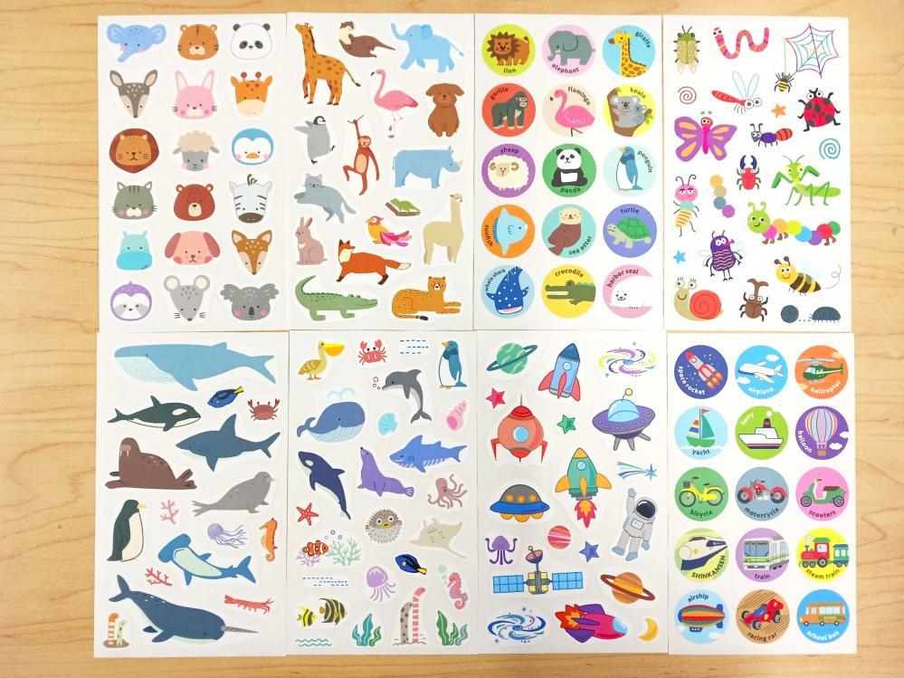 シートによって、シールの大きさや枚数は異なります。20枚くらいのシールがあるシートもあります。小さめのシールもあるので、小さな子どもの誤飲には注意が必要です。