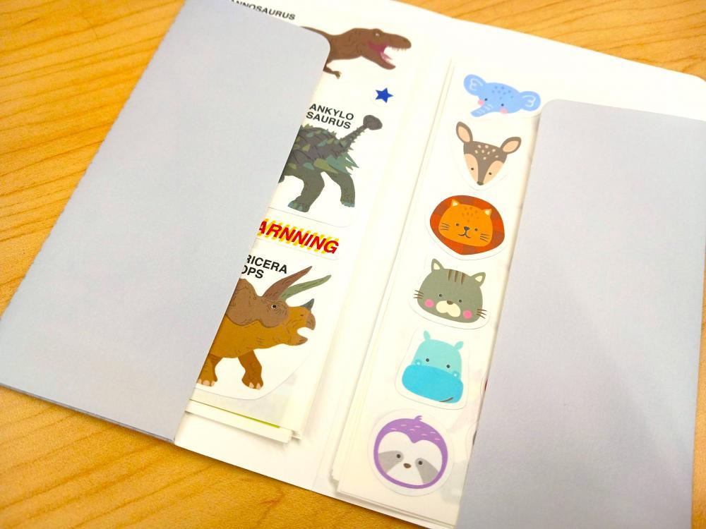 恐竜や動物、乗り物、テディベア、アイスなど、子どもが好きそうなモチーフのシール(計16シート)に収納ファイルがセットになっています。