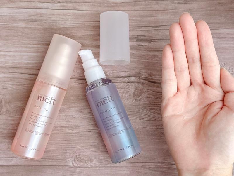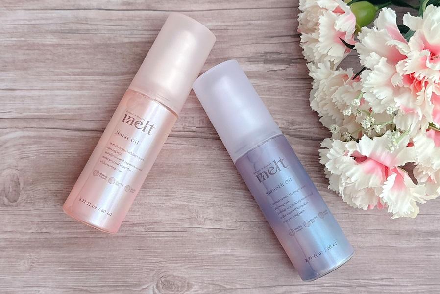 香りは、メルトの他アイテムと同様、「モイストオイル」はゼラニウム&ミュゲ、「スムースオイル」はピオニー&フィグ。香料の一部に天然製油をブレンドしていて、リラックスできるような香りになっています。