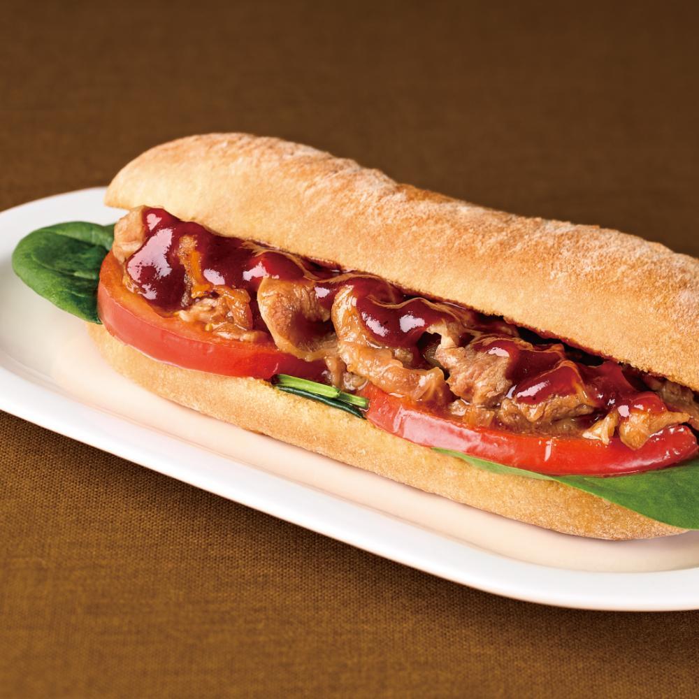 全粒粉入りパンに辛子マヨネーズを塗り、タレで下味をつけたやわらかい牛カルビ、店舗でカットしたサラダほうれん草とトマトをサンド。バーベキュー発祥のテキサス州ならではの旨みとコクをギュッと凝縮したBBQソースで仕上げ、トマトを焼き上げて旨みを引き出し、ソースのコクを際立たせています。