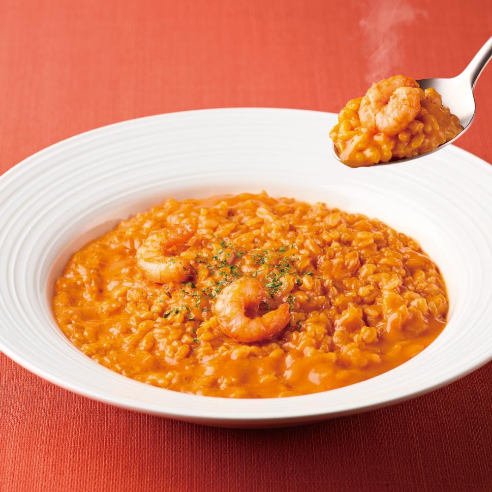 心地良い食感のリゾット専用米に、海老の旨みが凝縮された濃厚ソースがたっぷりと絡んでいます。海老の豊かな風味とトマトのさわやかな酸味が口いっぱいに広がり、濃厚ながら最後まで飽きのこない味わいです。好みで粉チーズをトッピングするのもおすすめです。