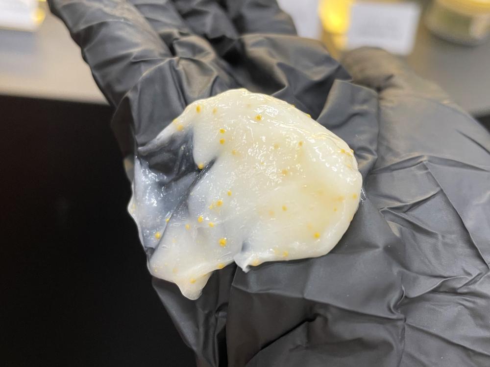手の温度が伝わるとあっという間にカプセルが溶け、クリーム全体がイエローに染まりました。クリームとカプセルが混ざり合う速さと色の変化に、2つの相性の良さが伝わります。