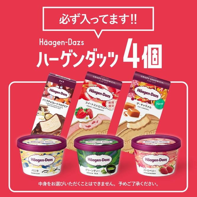 ハーゲンダッツのアイスが必ず4個入ります。また、森永製菓や明治・赤城乳業などの人気メーカーのアイスもたっぷり入りますよ。
