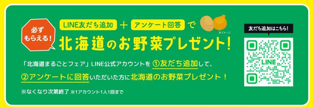 「北海道まるごとフェア」のLINE公式アカウントを友だち追加し、簡単なアンケートに回答すると、野菜がもらえます。
