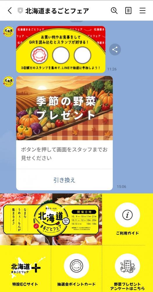 お得なキャンペーンもあります。イベントのLINE公式アカウントを友だち追加し、アンケートに回答すると、北海道の野菜がもらえます。なくなり次第終了です。