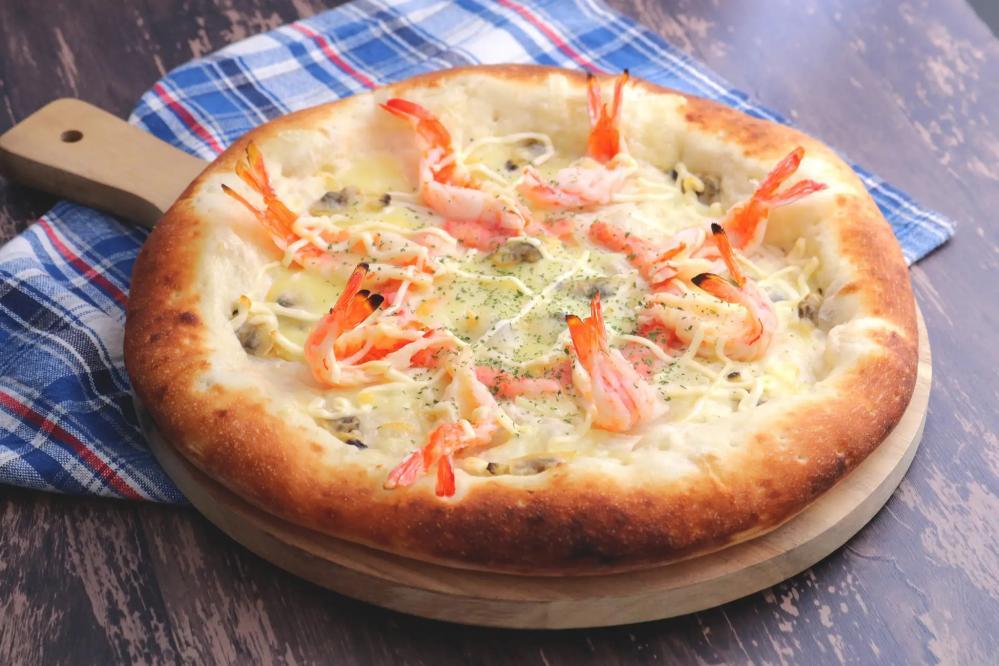 踊っているかのようなエビと豊かな風味の紅ズワイガニをトッピングした、贅沢なグラタンピザ。