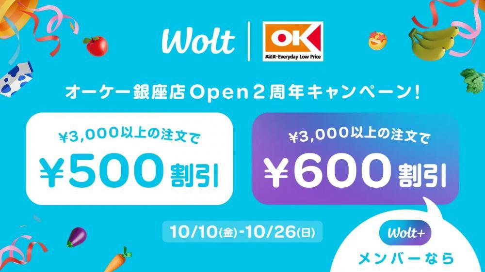 期間中、デリバリーサービス「Wolt」でオーケー銀座店から3000円以上注文すると、代金の合計から500円を割引、「Wolt+」の利用者は600円を割引します。