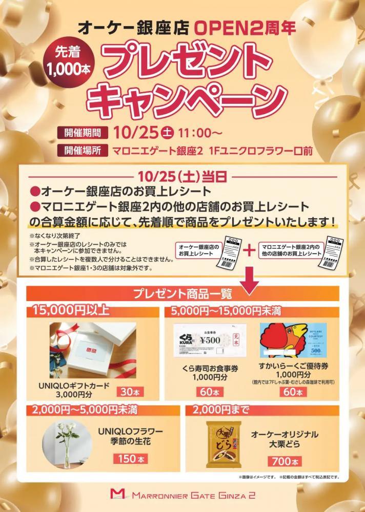 ファーストリテイリングが運営する商業施設「マロニエゲート銀座 2」で、2025年10月6日から26日までの期間、「オーケー銀座店」開業2周年を記念した「オーケー銀座店 OPEN2周年キャンペーン」を開催中です。