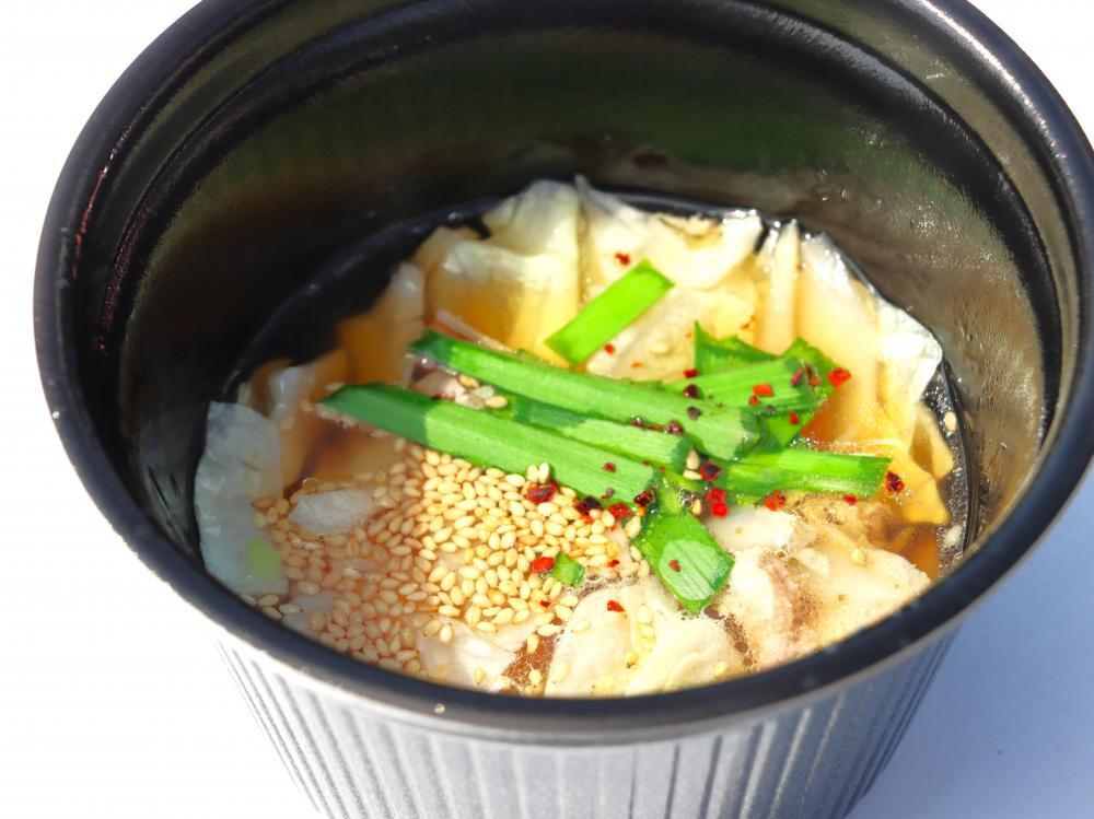筆者は王道の「カップもつ鍋(醤油)」(1000円)を食べました。キレのあるあっさりとした醤油スープ、とろける食感の国産牛もつが相性抜群でした。スープが美味しくて、余裕で全部飲みきれました。