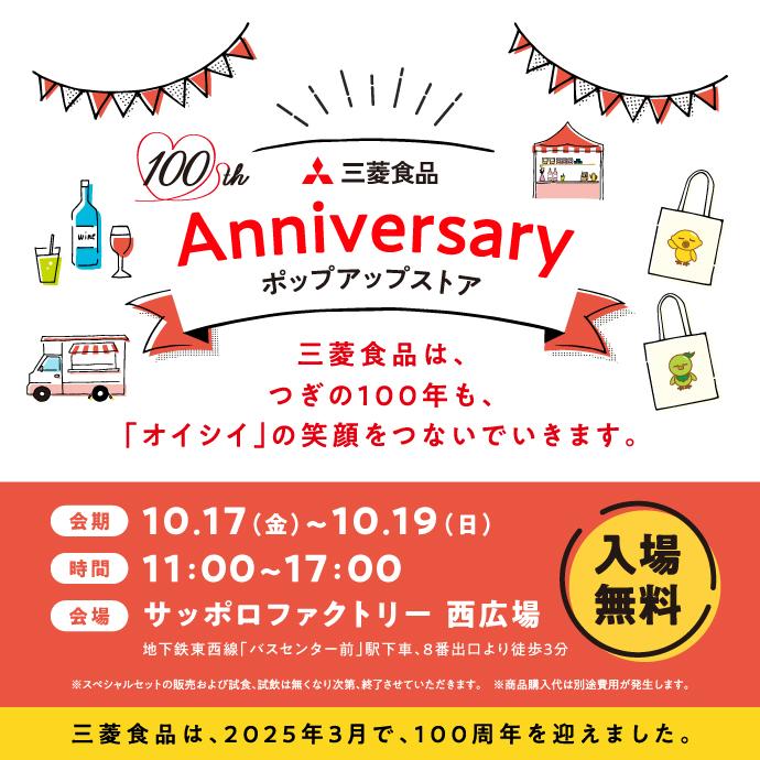 2025年10月17日から19日まで、サッポロファクトリー西広場(札幌市中央区)にて「三菱食品 100周年記念 ポップアップストア」が開催されます。