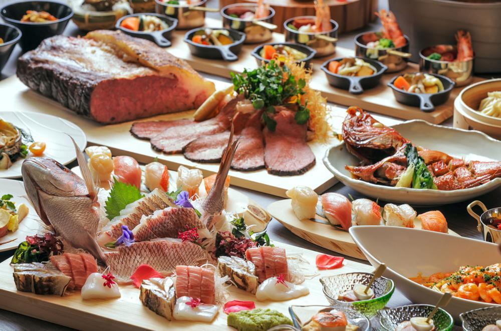 滞在中はアルコールを含むドリンクを自由に楽しむことができます。ビュッフェスタイルの食事では、種類豊富な寿司に加え、鰻や、ホタテ・サザエなど日替わりで提供。海の幸をはじめ全国の厳選食材を使った多彩なメニューが揃っています。地元の工房で作られたジェラートなど、様々なデザートも提供しています。
