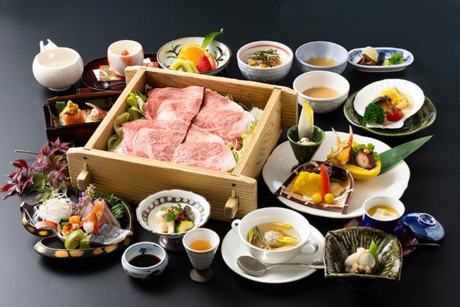 新鮮な大分の地元食材を活かした会席料理を味わうことができます。メインには、美しい霜降りが特徴のブランド牛「おおいた和牛」を存分に味わえる蒸ししゃぶしゃぶを通年で提供しています。肉の旨みを最大限引き出すため、部位や厚みにもこだわっており、たっぷりの野菜と一緒に楽しむことができます。