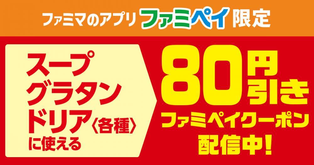 10月21日から11月3日までの期間、ファミペイ会員限定でスープ・グラタン・ドリアに使える80円引きクーポンを公式アプリで配信しています。