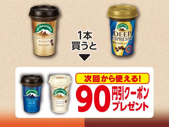 10月16日から22日までの期間、「マウントレーニア」の「カフェラッテ」「ディープエスプレッソ」のどちらか1本を購入すると、「マウントレーニア」の「カフェラッテ ノンシュガー」「クリーミーラテ」のどちらか1本に使える90円引きクーポンが1枚もらえます。