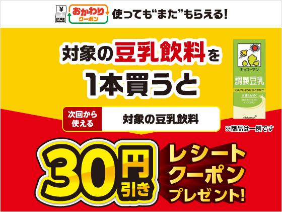 10月16日から29日までの期間、対象のキッコーマンの豆乳飲料を1本購入すると、次回使える30円引きクーポンが1枚もらえます。