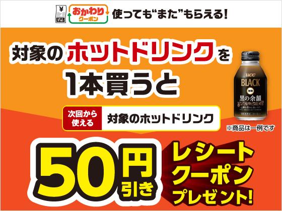 10月20日から12月21日までの期間、対象のホットドリンクを1本購入するごとに、次回使える50円引きクーポンが1枚もらえます。