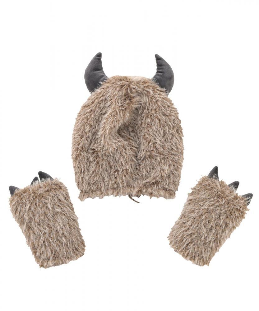 ぬいぐるみのようなボリュームのあるふわふわ素材に、角・爪の鋭いデザインがスパイスとして効いています。かぶりものの紐を結べば、ずり落ちる心配もありません。