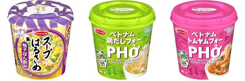 6つめの対象商品は、エースコック「スープはるさめ 柚子ぽん酢」「鶏だしフォー」「トムヤムフォー」です。