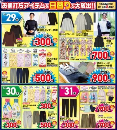 29日は20点限定の「裏起毛八分袖インナー各種」が330円、15点限定の「裏起毛パンツ各種」が550円、10点限定の「襟付ニットプルオーバー」「中綿ベスト」が770円。冬の寒さに打ち勝つウェアが、衝撃コスパでゲットできます。