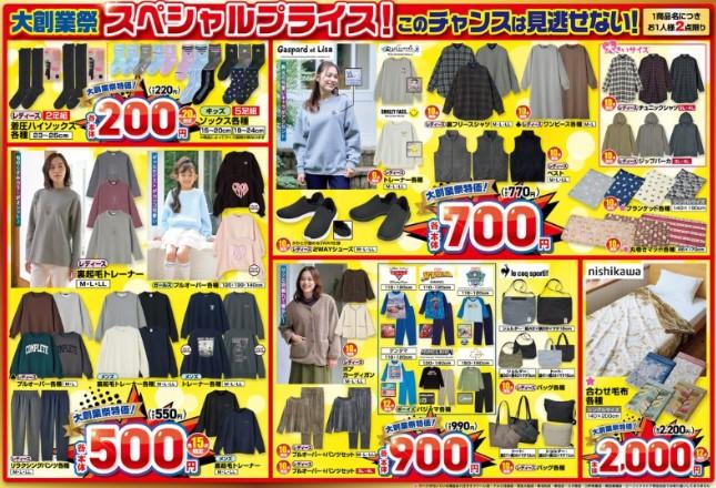 「2足組着圧ハイソックス各種」は220円、「裏起毛トレーナー」や「リラクシングパンツ各種」は550円という驚きの安さ......。